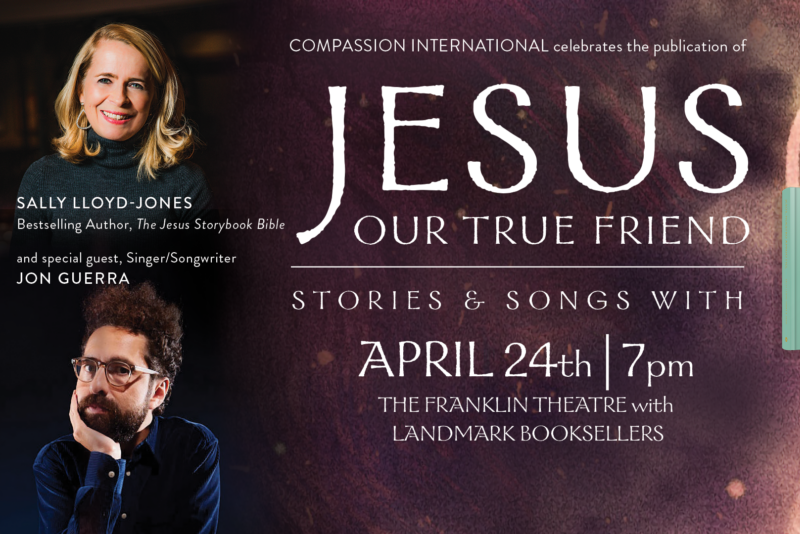 Join beloved storyteller Sally Lloyd-Jones for the release of her new book Jesus: Our True Friend on April 24 at 7pm at the Franklin Theatre. She will be joined by acclaimed singer/songwriter Jon Guerra for an evening filled with stories and songs at the Franklin Theatre. Perfect for families and fans of Sally’s beloved books, this event promises a truly lovely and deeply moving evening in Franklin.